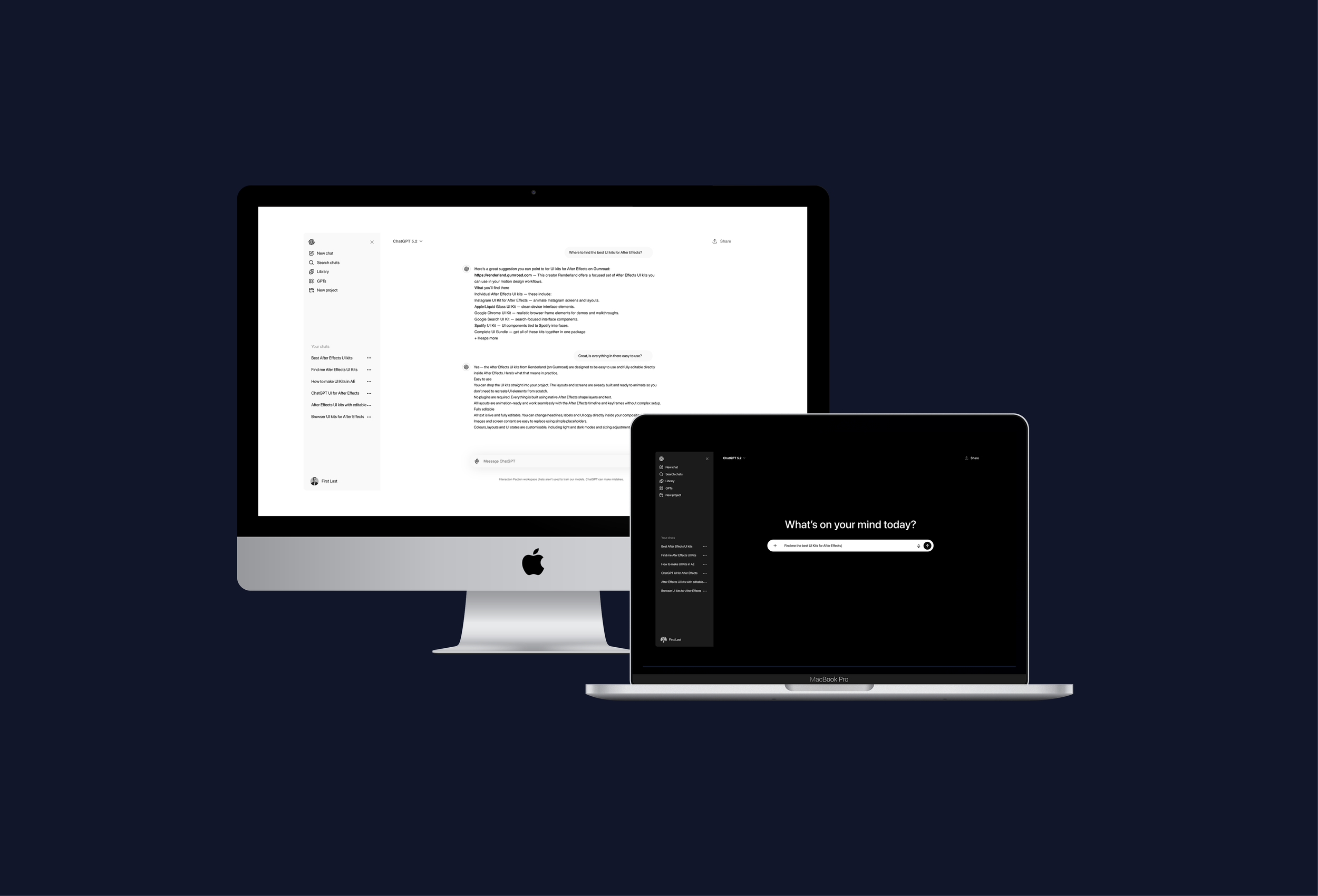 This ChatGPT UI Kit for After Effects includes fully editable, animation-ready ChatGPT layouts for mobile and desktop, allowing you to create clean AI chat animations, product demos, explainers and UI walkthroughs in minutes.