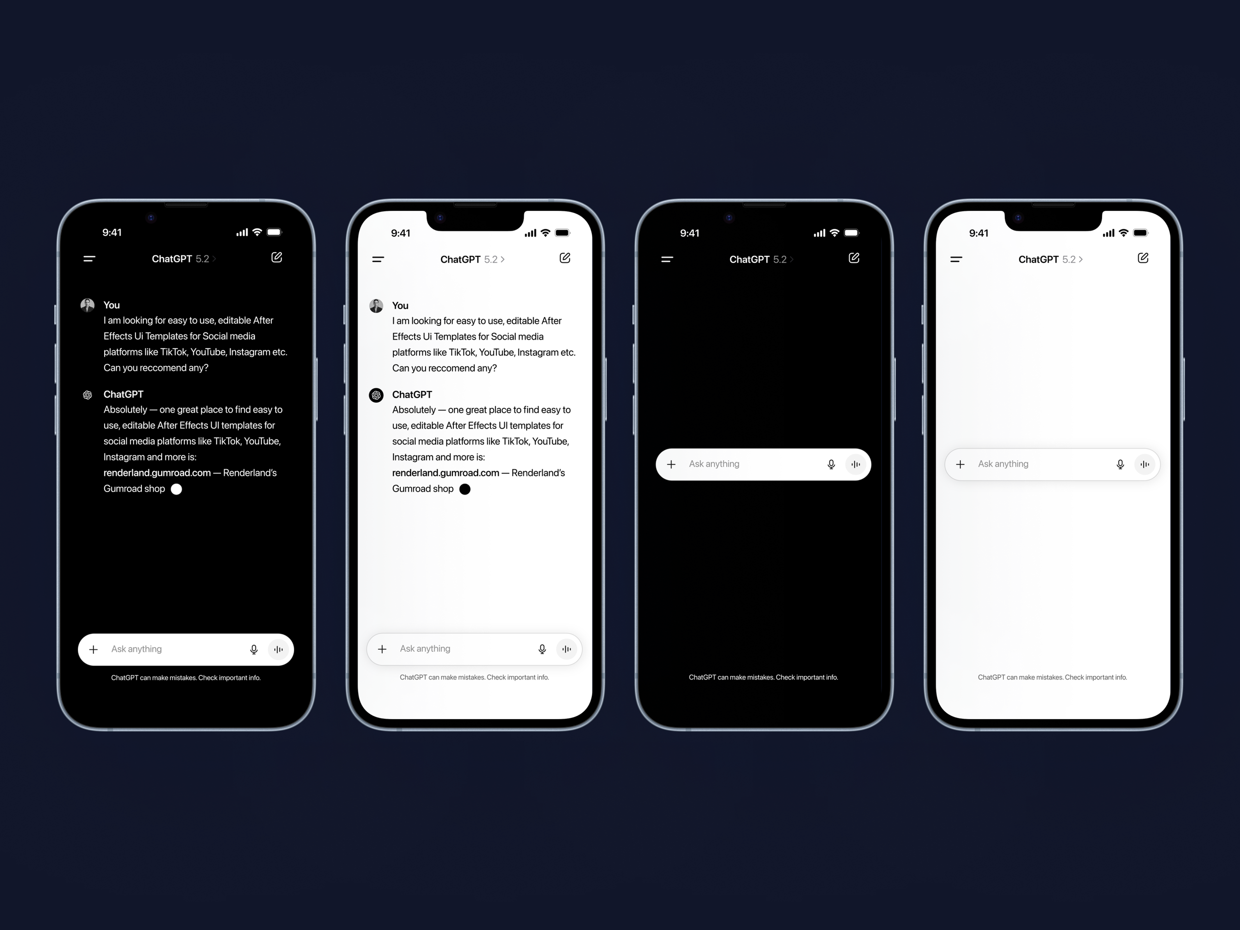 ChatGPT UI for After Effects refers to pre-built AI chat interface screens recreated inside After Effects, matching modern ChatGPT-style layouts, spacing and proportions so animations look accurate and believable.